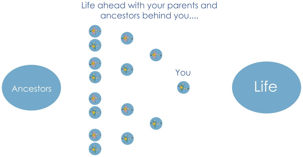 Family “programming” is unconscious and psychogenealogy helps bring it to the surface to be healed. Once the conflicts are healed, you can walk through life with your family in its healthy place as this drawing shows: